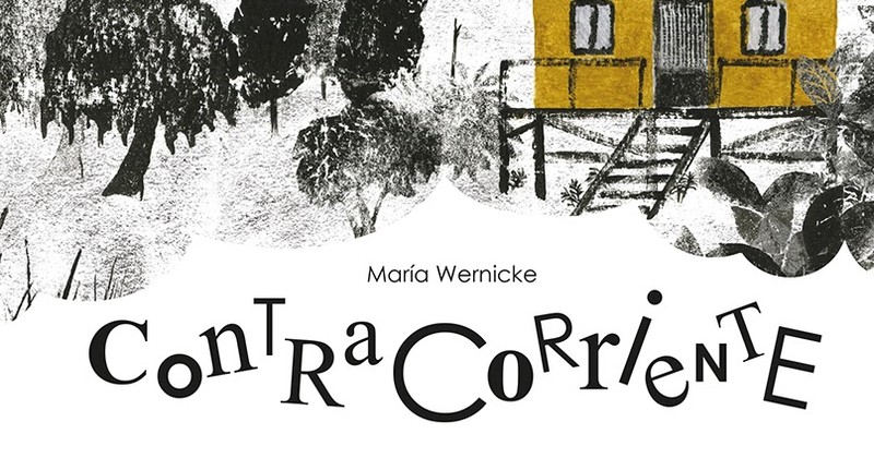 Contracorriente es un libro álbum de María Wernicke donde las letras irrumpen en la ilustración convirtiéndose en olas, aves, yararás; donde, sin necesidad de un color protagonista, la autora crea un río que corre, lleva, riega, rastrea caminos y da vida a las palabras.