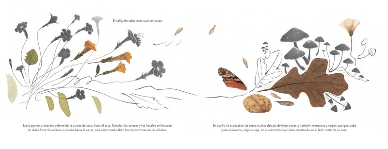 El calígrafo intuía que más allá del valle y de las montañas había otros valles y otras montañas, y soñaba con contar a unos las historias de otros. Así que un día, en lugar de sentarse a su escritorio, envolvió cuatro cosas y se adentró en el espeso bosque. Fue así como el calígrafo empezó a trazar caminos y las gentes descubrieron que no estaban solas. Este álbum quiere transmitir los valores que aportan los viajes: la transformación de uno mismo, la capacidad de saber acoger al otro, el deseo de aventura y de descubrimiento... No tan solo los viajes que se realizan a través del mundo, sino aquellos a donde nos llevan las palabras, las imágenes y la imaginación. Para ayudarnos a trasladarnos a este mundo creativo, la autora ha querido colaborar con el ilustrador y diseñador colombiano Samuel Castaño, quien tiene el don de saber plasmar la magia que todo lo que nos rodea de una manera sencilla pero fascinante: mediante la técnica le collage, incorpora periódicos viejos, telas y otros elementos de la naturaleza (hojas, ramas...), que dan vida, cuerpo y color a sus ilustraciones.