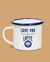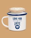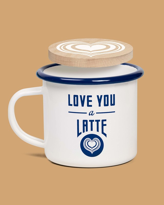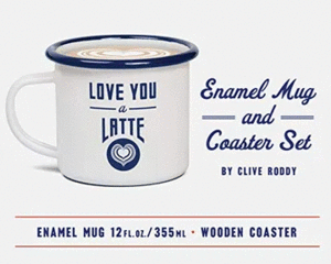 Sip your cup of joe from this handsome enamel mug and keep your table safe with the accompanying wooden coaster that has perfectly painted latte art.